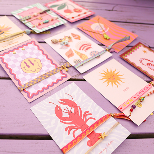 Deze unieke sieraden kaartjes zijn ontworpen door ons eigen design team! Maak de sieraden kaartjes compleet met zelfgemaakte kettingen en lint met tekst armbanden met vrolijke designs. Voeg een smartbeadstopper met oogje toe aan de armbanden en hang er zomerse bedels eraan. Mix & match voor een vrolijke collectie!