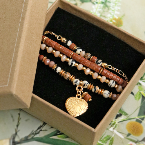 Laat je hier inspireren om zelf aan de slag te gaan met de nieuwste natuursteen kralen! Dit keer zijn wij aan de slag gegaan met onder andere natuursteen kralen en Artistic Wire. Maak bijvoorbeeld een prachtige armband of oorbellen door het draad om de natuursteen kralen te wikkelen. Je begint voor de armband met een lang stuk Artistic Wire wat je dubbel buigt. Met de bocht die je dan krijgt maak je het oogje. Vanaf dan ga je de kralen over het draad rijgen en wikkel je met het andere eind steeds om het draad en de kralen heen. Als je klaar bent kun je met het draad ook een haakje buigen waardoor je direct een bijpassende sluiting hebt. De techniek van het wikkelen van het draad kun je ook heel leuk terug laten komen in een paar oorbellen. Maak de set compleet en combineer natuursteen kralen, DQ metalen kralen, top facet kralen met elkaar op bijvoorbeeld elastisch rijgdraad. Succes!