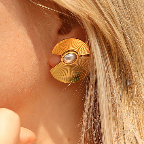 Roestvrij stalen (RVS) Stainless steel oorbellen / oorstekers waaier met imitatie parels Gold