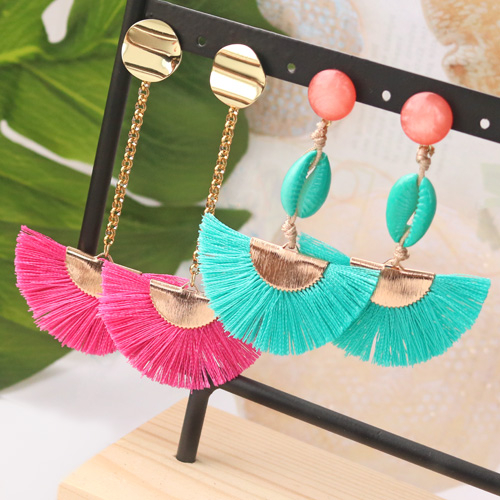 Kleurrijke oorbellen met vrolijke kwasten, kauri schelpen en DQ metaal