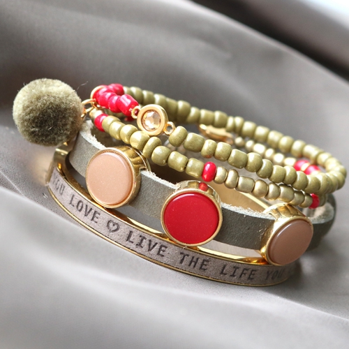 Laat je inspireren door deze leuke sieraden set met Stainless steel armbanden, rocailles en items van Cuoio. Absolutely fabulous! Deze kleuren zijn natuurlijk helemaal geweldig maar je kunt dit setje ook in andere kleurtjes samenstellen. Maak leuke armbandjes met rocailles en voeg Swarovski steentjes toe in diverse settingen zoals een tussenstuk voor SS30 en SS20 flatback Swarovski steentjes. Voeg de Swarovski’s ook toe als hangertje met een DQ metalen setting met één oog voor SS30 en SS20. Maak ook een matching Cuoio armband in dezelfde kleurstelling. Vervolgens kun je ook armbanden van Stainless steel toevoegen zoals een armband met quote en een armband voor 5 mm plat leer. Een trendy setje armbanden voor elke dag!