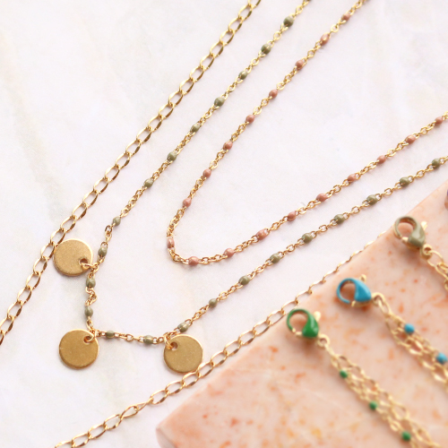 Sieraden maken van topkwaliteit, met een stijlvolle uitstraling en een kleine touch of colour? Ga dan aan de slag met het nieuwste stainless steel jasseron en karabijn sloten met gekleurde oil details. Deze items passen perfect bij elkaar en hiermee maak je de leukste armbanden en kettingen. Probeer ook zeker het jasseron met oil details te combineren met een andere variant jasseron voor een speels effect. Je kunt het combineren door in jouw armband of ketting twee lagen te creëren. Je bevestigd de twee lagen wel aan hetzelfde slot waardoor het een item wordt. Als leuk detail kun je een stainless steel bedel bij het slotje bevestigen of hang bijvoorbeeld meerdere bedels in het midden van de ketting met een buigring.