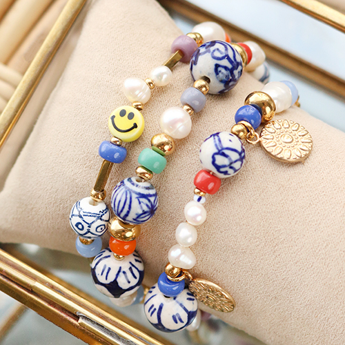 Deze nieuwe serie keramiek kralen leent zich uitstekend voor het maken van een unieke collectie sieraden. Je kunt de kralen verwerken in een armband door ze aan te rijgen met zoetwaterparels, rondellen kralen, glaskralen en metalen bedels voor een trendy look. Met behulp van een nietstift verander je de kraal in een bedel die je als ketting kunt gebruiken maar die ook heel mooi staat in combinatie met een zoetwaterparel aan een oorbel.