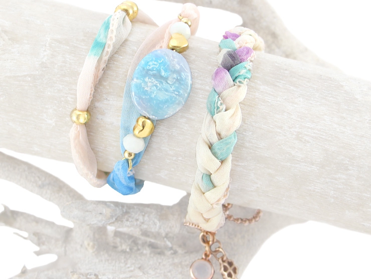 Wauw! Wat een gave inspiratie set is dit! Er is gebruik gemaakt van de horlogekast Geneva in de kleur goud om een uniek en trendy horloge te maken. De band van het horloge is gemaakt van bohemian satijn draad in combinatie met rocailles en DQ metaal. Wat een super leuk effect ontstaat er dan! Ook is er een bijpassende ketting gemaakt van bohemian satijn draad en DQ metaal. Een echte musthave voor in iedere sieraden collectie! Het nieuwe wrap koord is super leuk om sieraden mee te maken bijvoorbeeld deze mooie armbanden! Dit koord is echt heel fijn om mee te werken. Er zit namelijk ijzerdraad in waardoor het zeer buigzaam is.