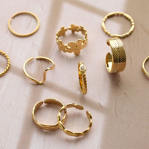 Deze handige serie roestvrij stalen ringen bestaat uit ringen met verschillende designs, zoals een bloem en een hartje. Alle ringen zijn verkrijgbaar in de kleuren goud en zilver en zijn verstelbaar in maat. Een super mooie serie om je sieraden collectie mee aan te vullen!