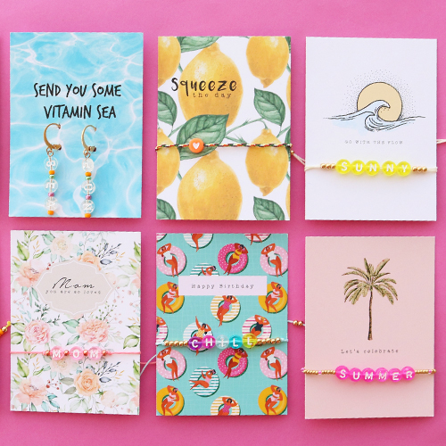 Inspiratie nodig voor het maken van leuke zomerse sieraden? Wij gingen je voor en maakte met macramé en acryl letterkralen deze toffe armbanden. Je kunt de acryl letterkralen namelijk over het macramé draad rijgen en zo armbanden maken met leuke quotes of namen! Natuurlijk kun je het macramé draad ook knopen of vlechten in leuke patronen. Om de set met armbanden compleet te maken kun je op elastiek een combinatie van acryl letterkralen en Miyuki kralen rijgen. Zo krijg je een afwisselende set met items die perfect bij elkaar passen! Naast armbanden kun je met deze items ook super leuke oorbellen maken. Presenteer deze fantastische sieraden op de nieuwste kleine sieradenkaartjes en klaar is jouw zomercollectie!